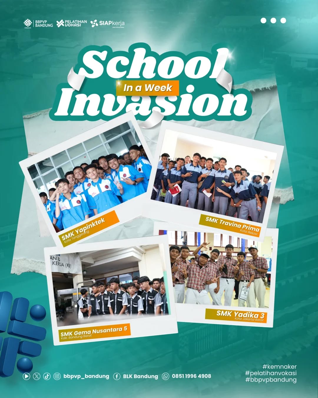 BBPVP Bandung menerima kunjungan edukatif dari sejumlah Sekolah Menengah Kejuruan (SMK) dalam rangka kegiatan bertajuk School Invasion. Sekolah yang berpartisipasi dalam kegiatan ini antara lain SMK Mathla'ul Anwar (Kab. Bandung), SMK Cendekia Paseh (Kab. Bandung), SMK Putra Bahari (Kab. Bandung), serta SMKN 1 Penawartama (Kab. Tulang Bawang).