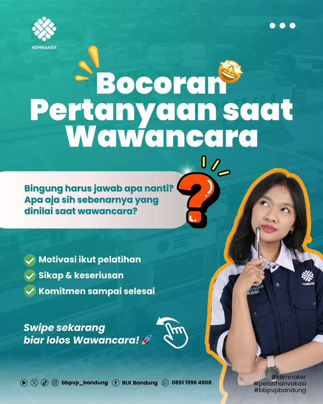 Menghadapi tahap wawancara seringkali membuat calon peserta merasa tegang. Padahal, tahap ini adalah kesempatan bagi Anda untuk menunjukkan keseriusan dan komitmen dalam mengikuti program pelatihan di BBPVP Bandung.
