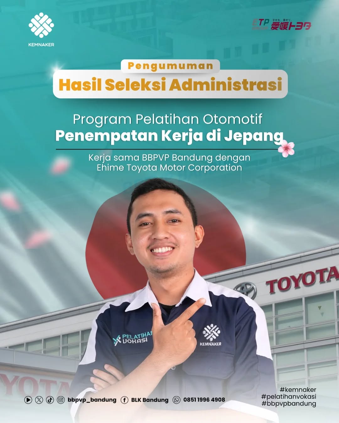 Balai Besar Pelatihan Vokasi dan Produktivitas (BBPVP) Bandung, bekerja sama dengan Ehime Toyota Motor Corporation, secara resmi mengumumkan daftar peserta yang dinyatakan LULOS tahap Seleksi Administrasi untuk Program Pelatihan Otomotif dengan Penempatan Kerja di Jepang.